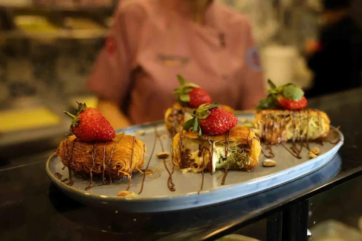 Kaymağın ve çikolatanın kadayıf sarıldıktan sonra çilek, fıstık ve çikolata sosuyla buluştuğu “Çikolatalı Kaymaklı Kadayıf Sarma”, tatlı tutkunlarının favorisi haline geldi. Ürün, yoğun çikolata aromasıyla kaymağın eşsiz lezzetini bir araya getiriyor.